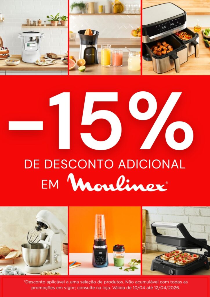 De 10 a 12 de abril, aproveite -15% de desconto adicional numa seleção de produtos Moulinex, disponível na loja Tefal do Campera Outlet Shopping.